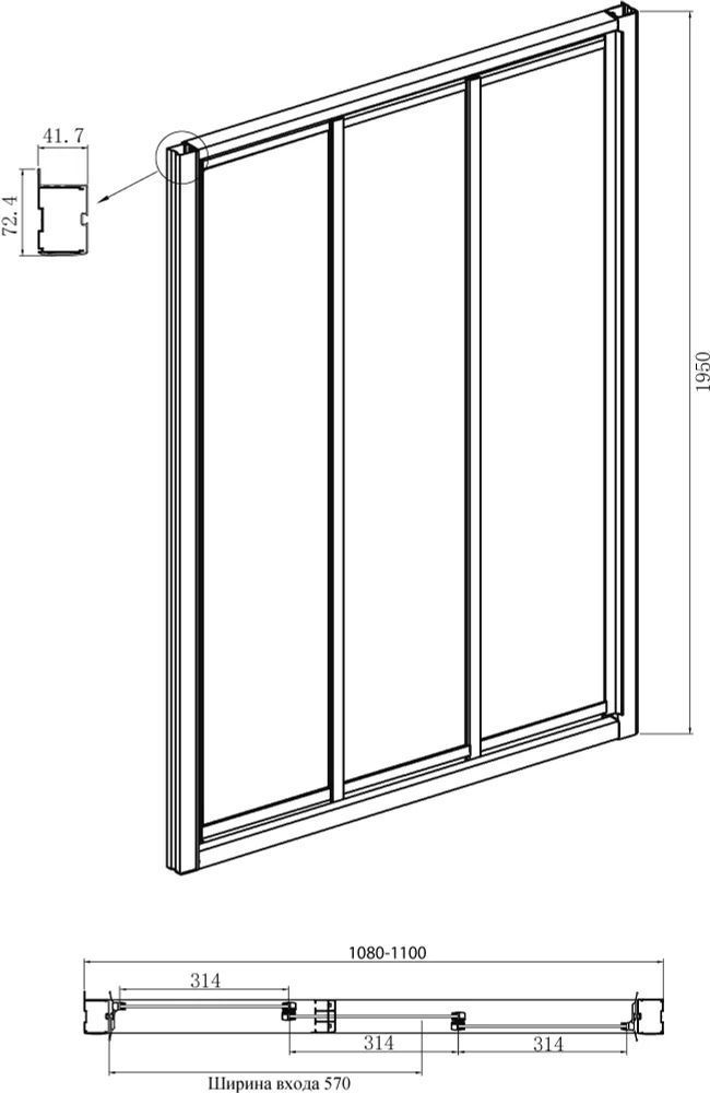 Душевая дверь Ambassador Forsa, размер 1100х1950 мм, профиль хром, стекло прозрачное 4 мм. Габариты регулировки (1080x1100)x1950 мм, ширина входа 570 мм. Поддон приобретается отдельно.
