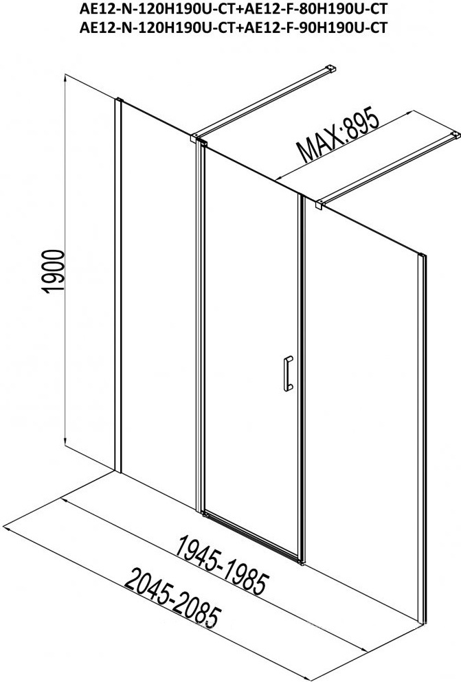 Душевая дверь Aquanet Cinetic, размер 2100х1900 мм. Профиль хром, стекло прозрачное 6 мм. Габариты регулировки (2045-2085)х1900 мм.