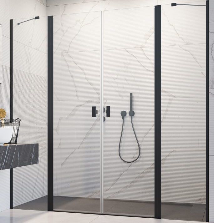Душевая дверь Radaway Nes Black DWD II 1700x2000 мм, состоящая из распашной двери 930 и комплекта неподвижных стенок 770, стекло - прозрачное 6 мм, профиль - черный. Размеры с диапазоном регулировок: 1680-1710 мм. Ширина входа: 940 мм. Поддон приобретается отдельно.