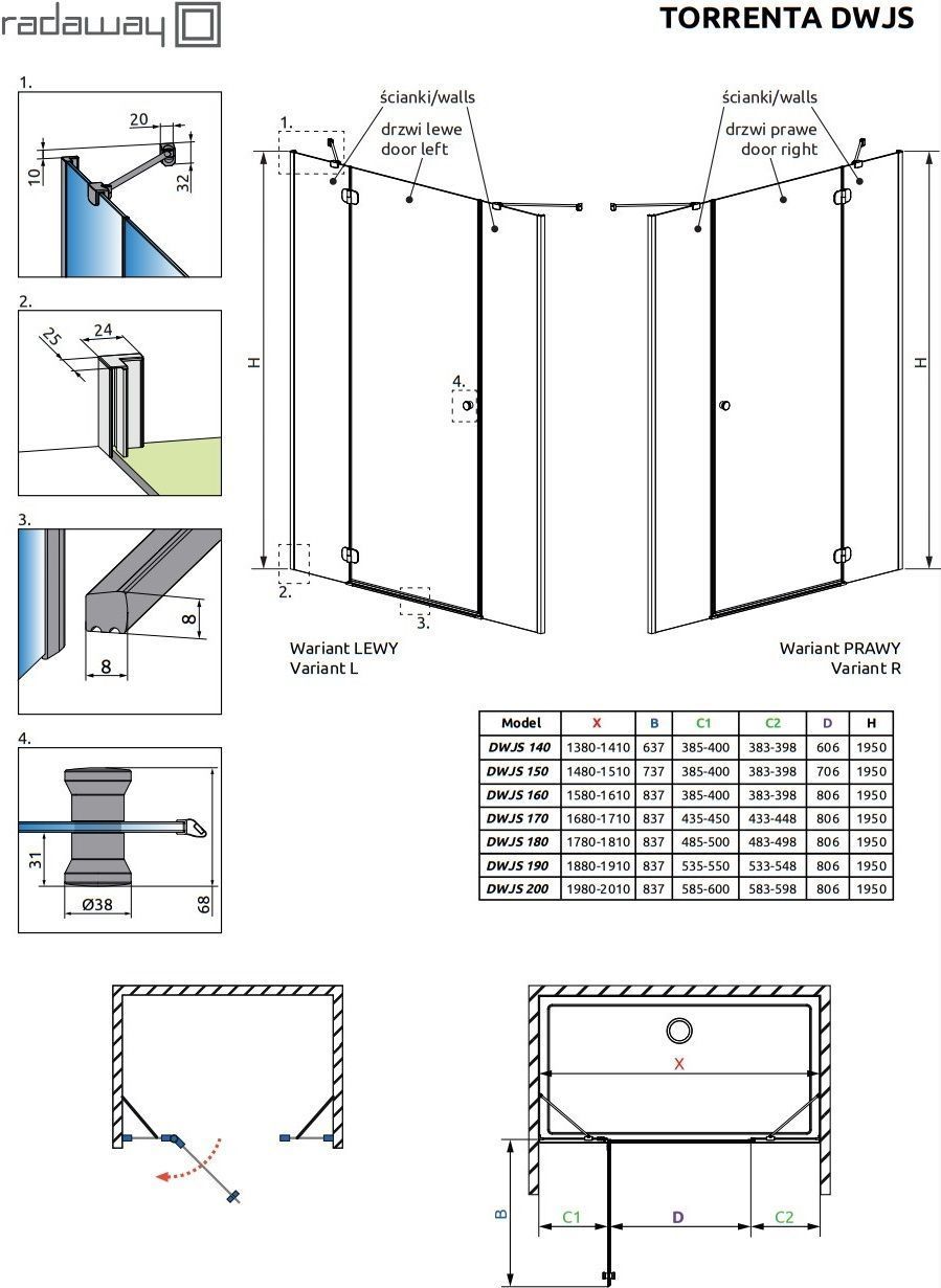 Душевая дверь Radaway Torrenta DWJS 1700x1950 мм, состоящая из распашной двери 812 L и комплекта неподвижных стенок 420, стекло - прозрачное 6 мм, профиль - хром. Размеры с диапазоном регулировок: 1680-1710 мм. Ширина входа: 806 мм. Поддон приобретается отдельно.