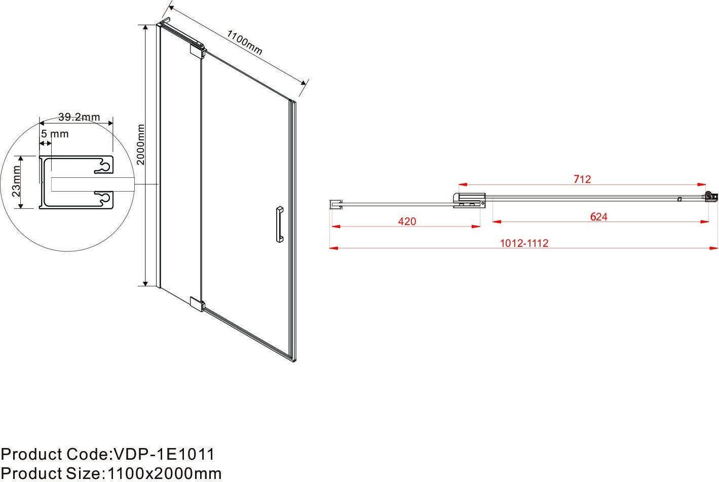 Душевая дверь Vincea Extra 1000-1100х2000 мм, стекло - прозрачное 8 мм, профиль - черный, ширина входа - 624 мм, габариты с диапазоном регулировок: 1012-1112 мм, поддон приобретается отдельно.