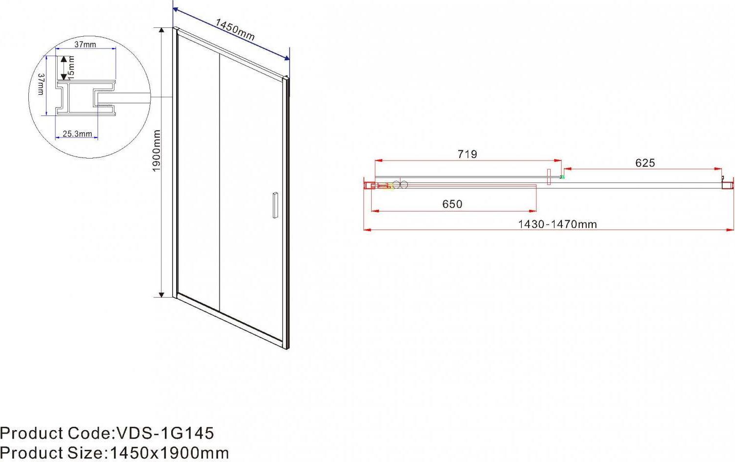 Душевая дверь Vincea Garda VDS-1G150CLG, размер 1500x1900 мм, профиль брашированное золото, стекло прозрачное, вход 650 мм, габариты регулировки (1480-1520)x1900 мм. Поддон приобретается отдельно.