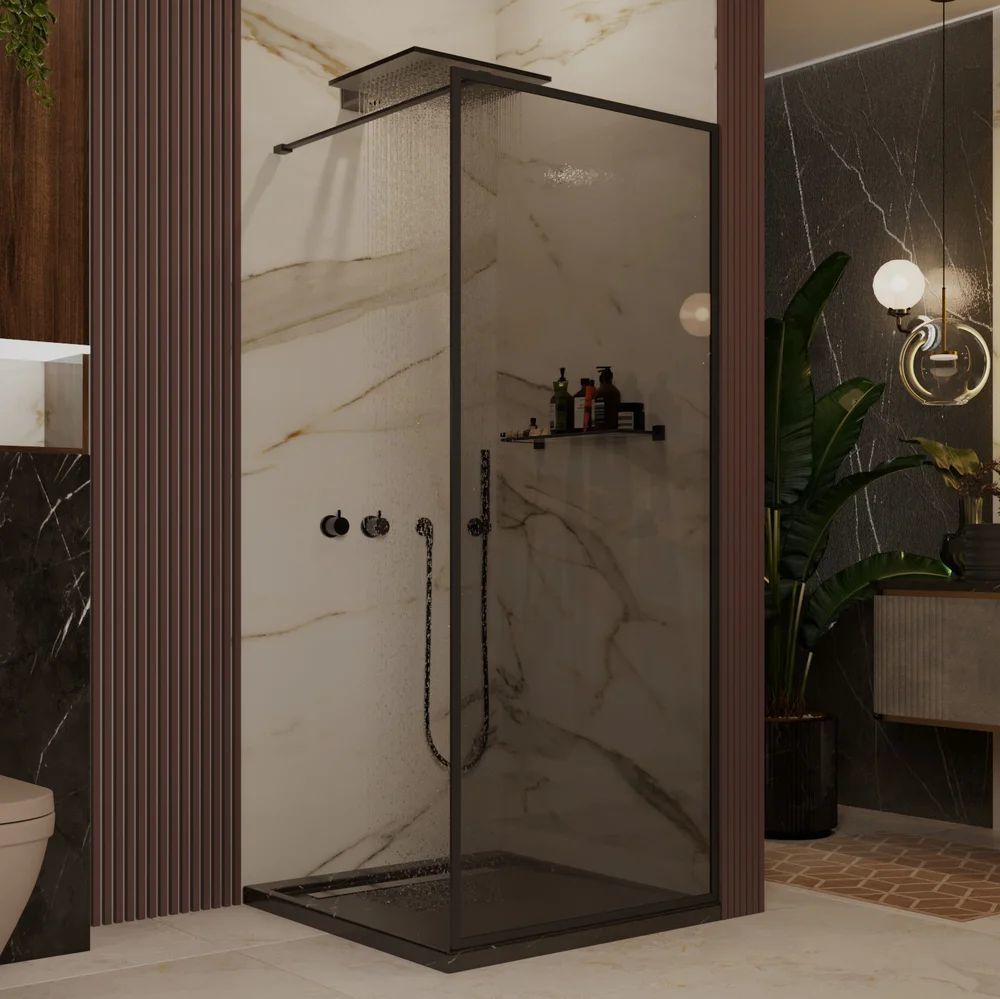 Душевая перегородка Ambassador Walk-in с кронштейном, размер 1195х2000 мм, профиль чёрный, стекло тонированное. Ширина входа 1000 мм.