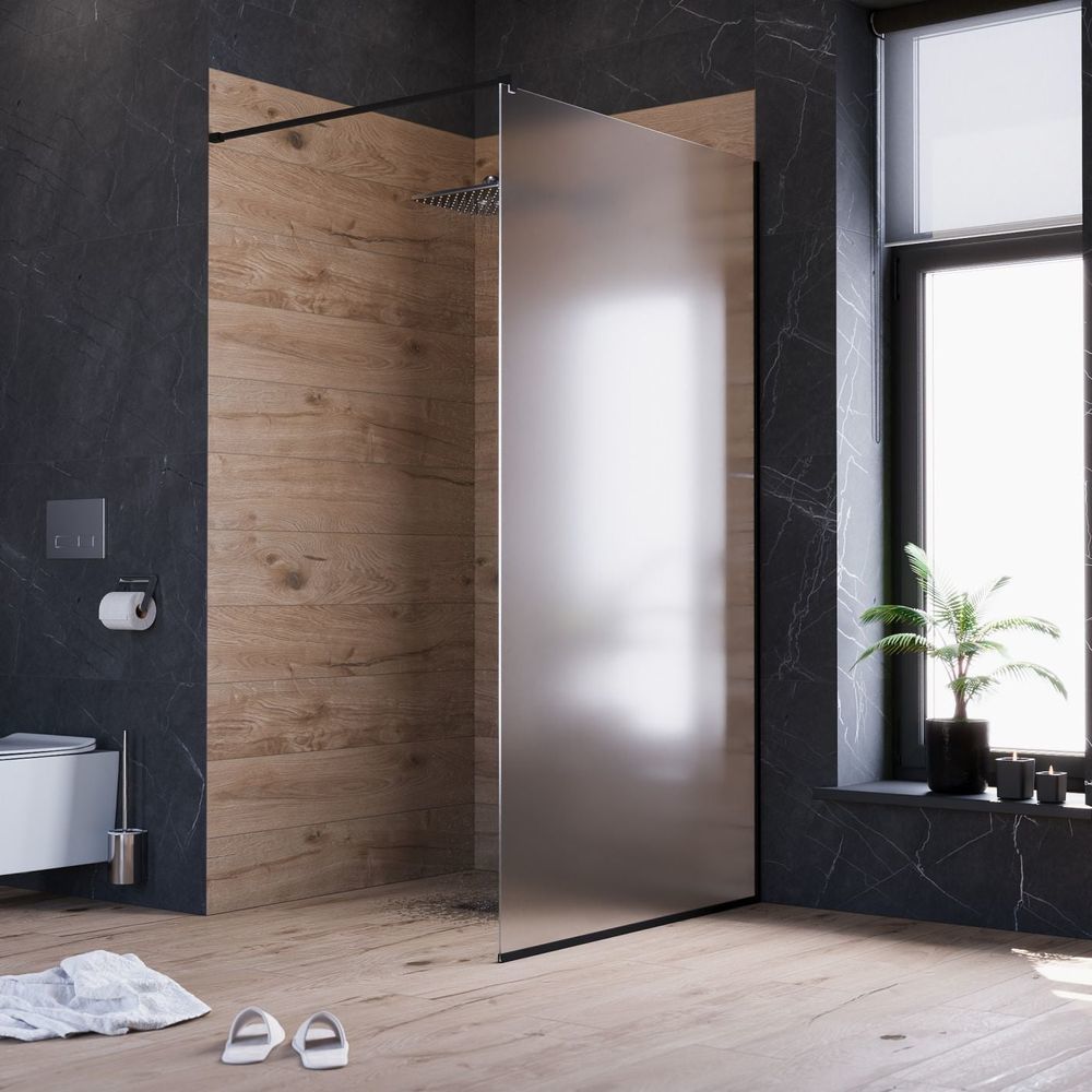 Душевая перегородка Mirsant Walk in с аксессуарами, профиль чёрный, стекло матовое.