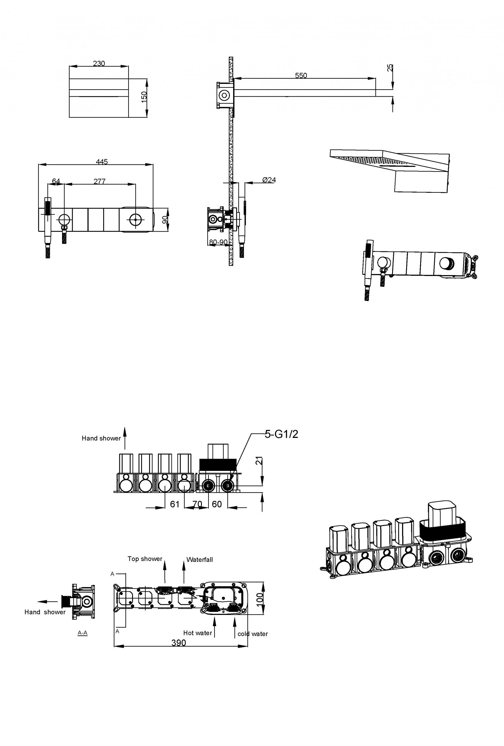 • Верхний душ размером 550мм*230мм с функцией тропического душа и водопада.