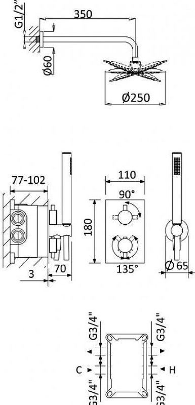 Характеристики душевая система без излива Cezares (LEAF-DSIP-T-25-01)