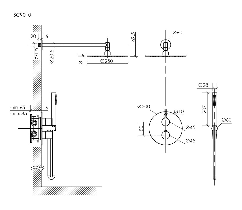 • Верхний душ из нержавеющей стали , Ø250 мм, с возможностью регулировки угла наклона