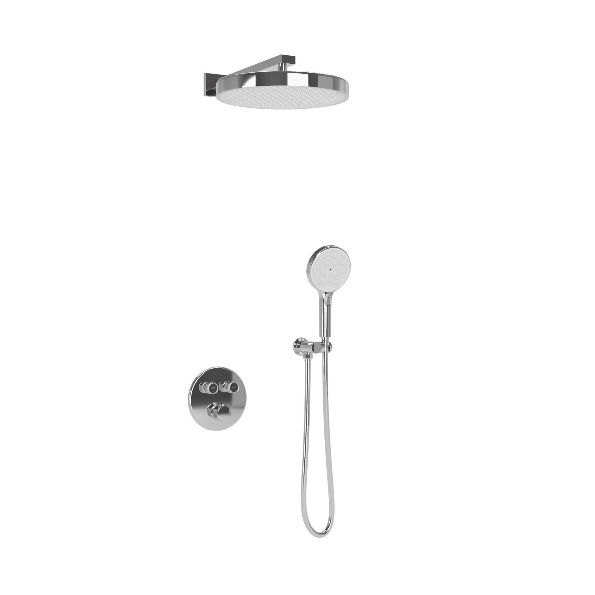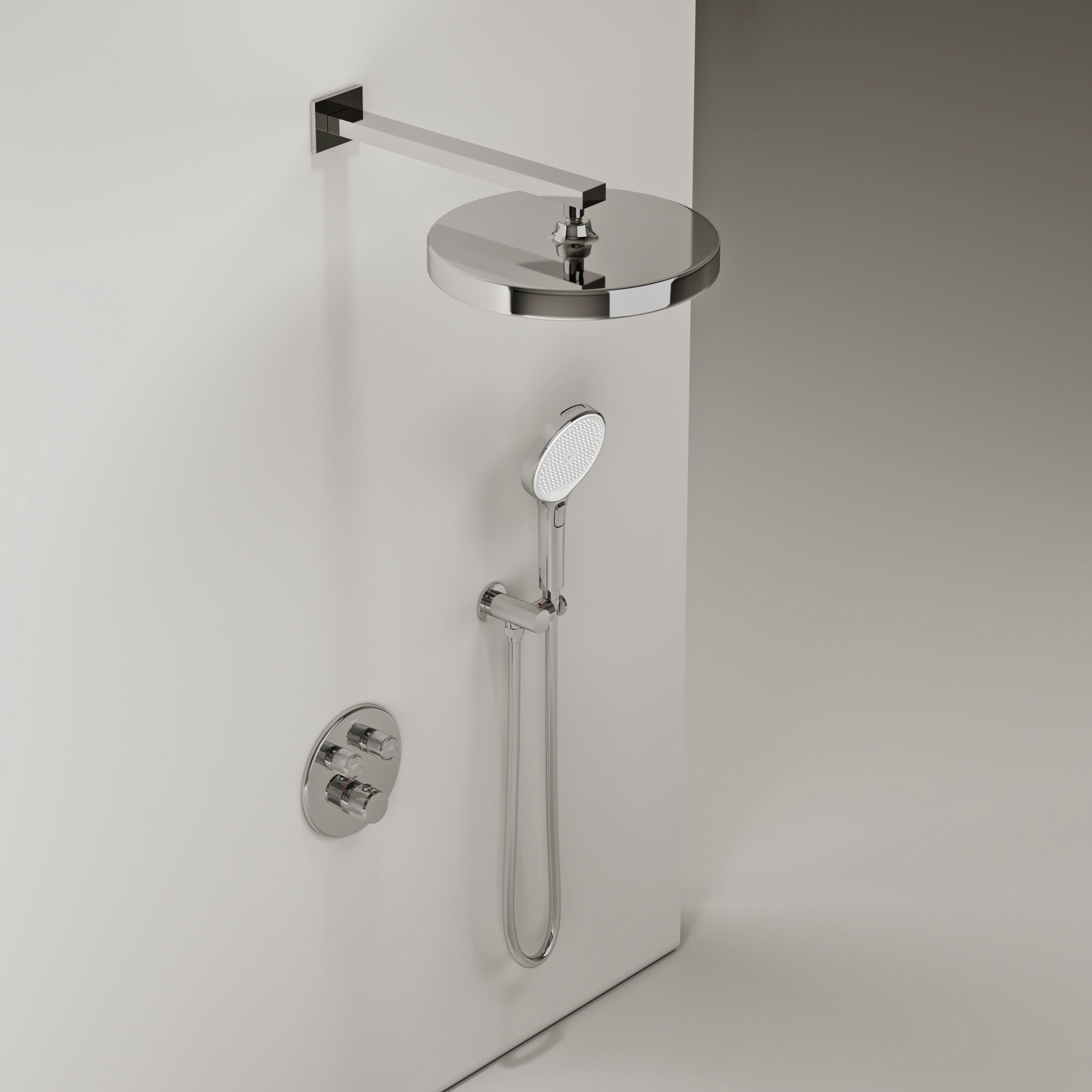 • Встраиваемый термостатический смеситель с внутренним блоком в комплекте. Удобное кнопочное управление между источниками воды.