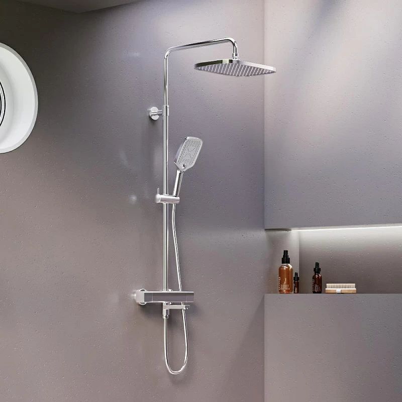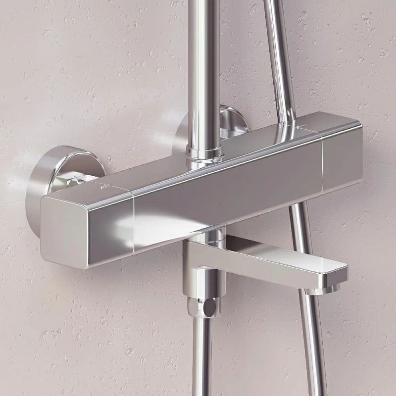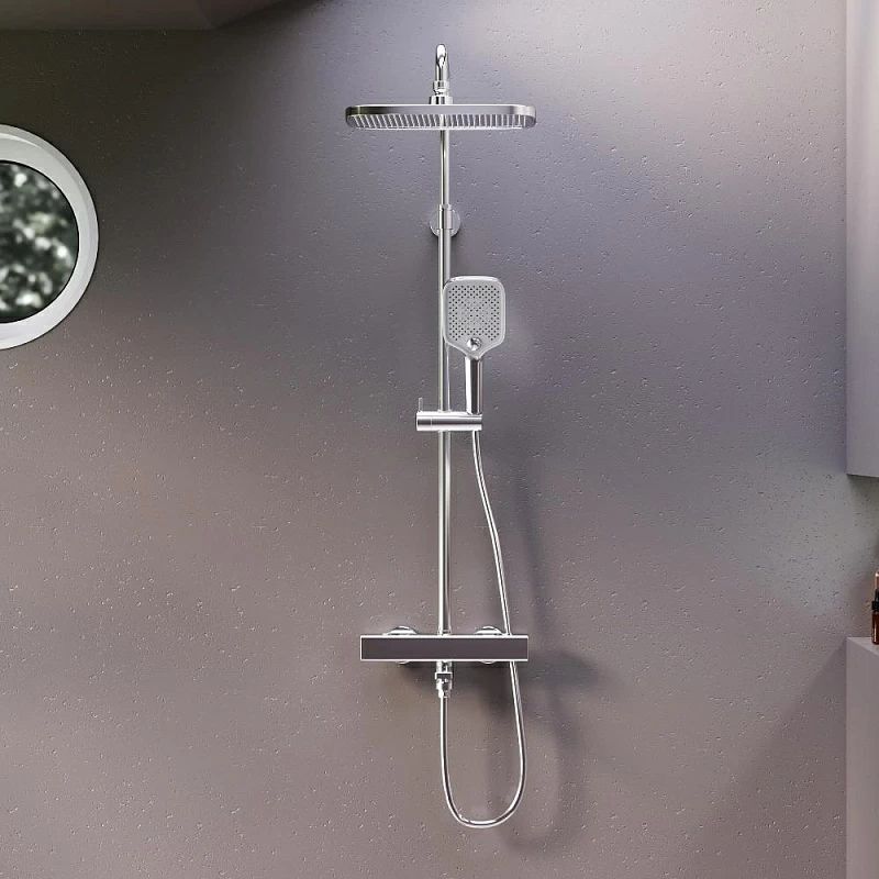 - В комплектацию душевой системы входят: тропический душ, ручной душ, термостатический смеситель.