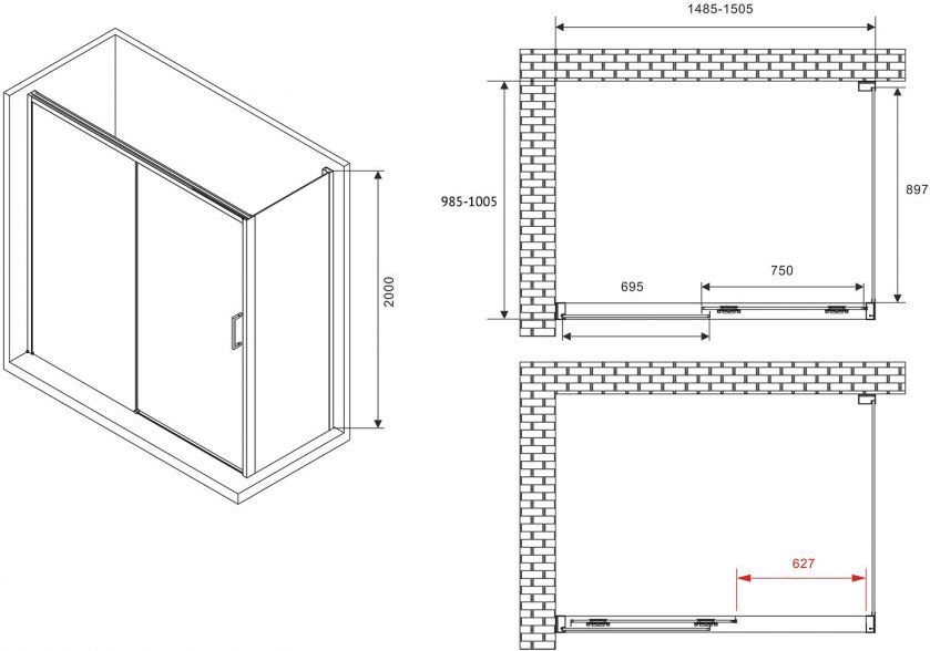 Душевое ограждение Abber Komfort, размер 1500х1000х2000 мм, профиль чёрный, стекло прозрачное 8 мм, габариты регулировки (1485-1505)х(985-1005)х2000 мм, вход 627 мм. Поддон приобретается отдельно. Дверь 150 см, душевая стенка 100 см.