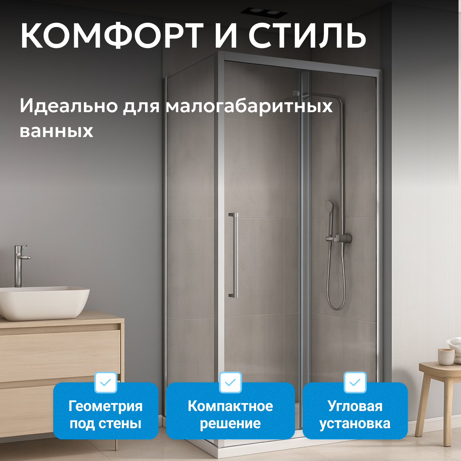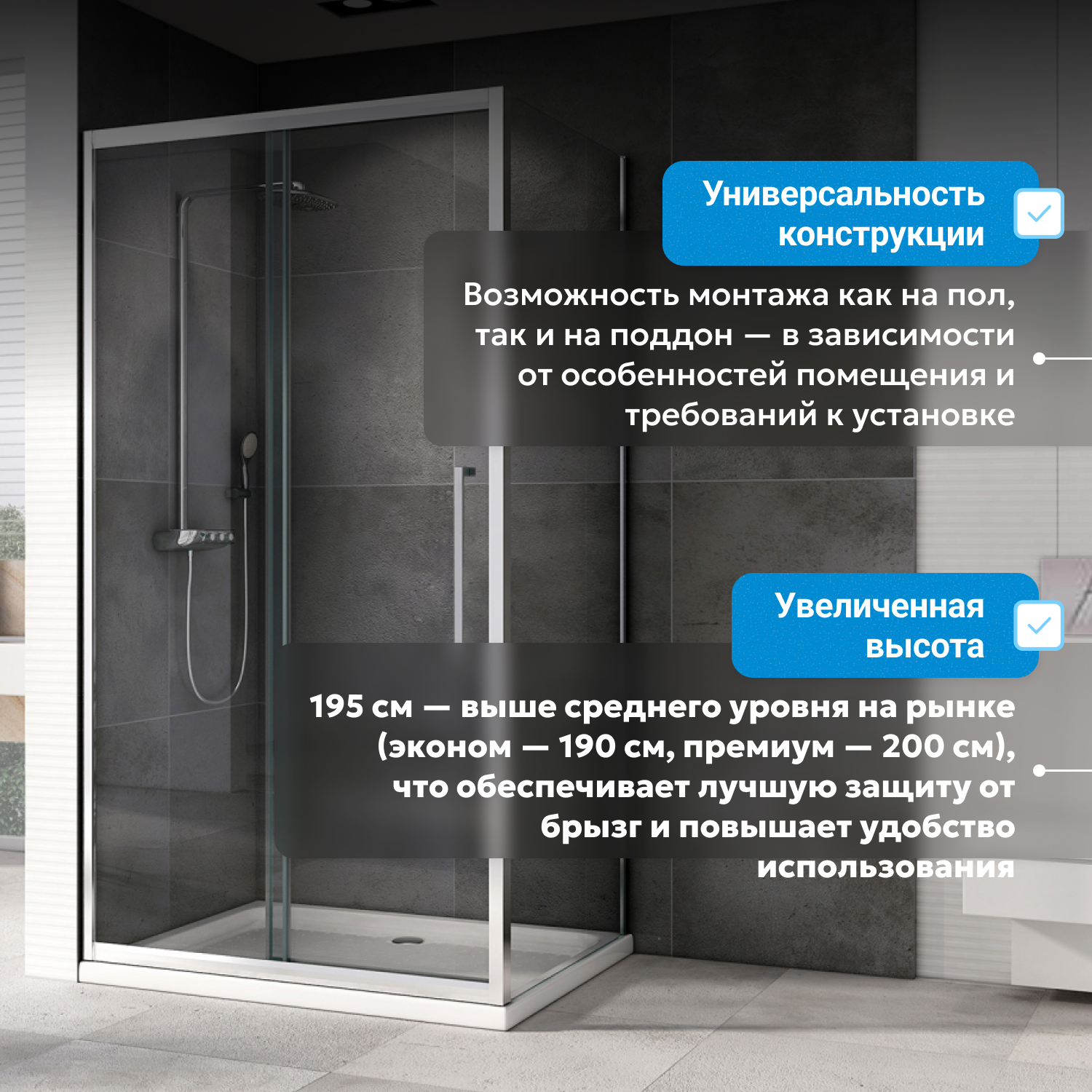 - Прямоугольная форма и прозрачное закалённое стекло толщиной 6 мм визуально расширяют пространство и легко вписываются в большинство интерьеров. Прочная конструкция рассчитана на долгий срок службы и ежедневное удобство.