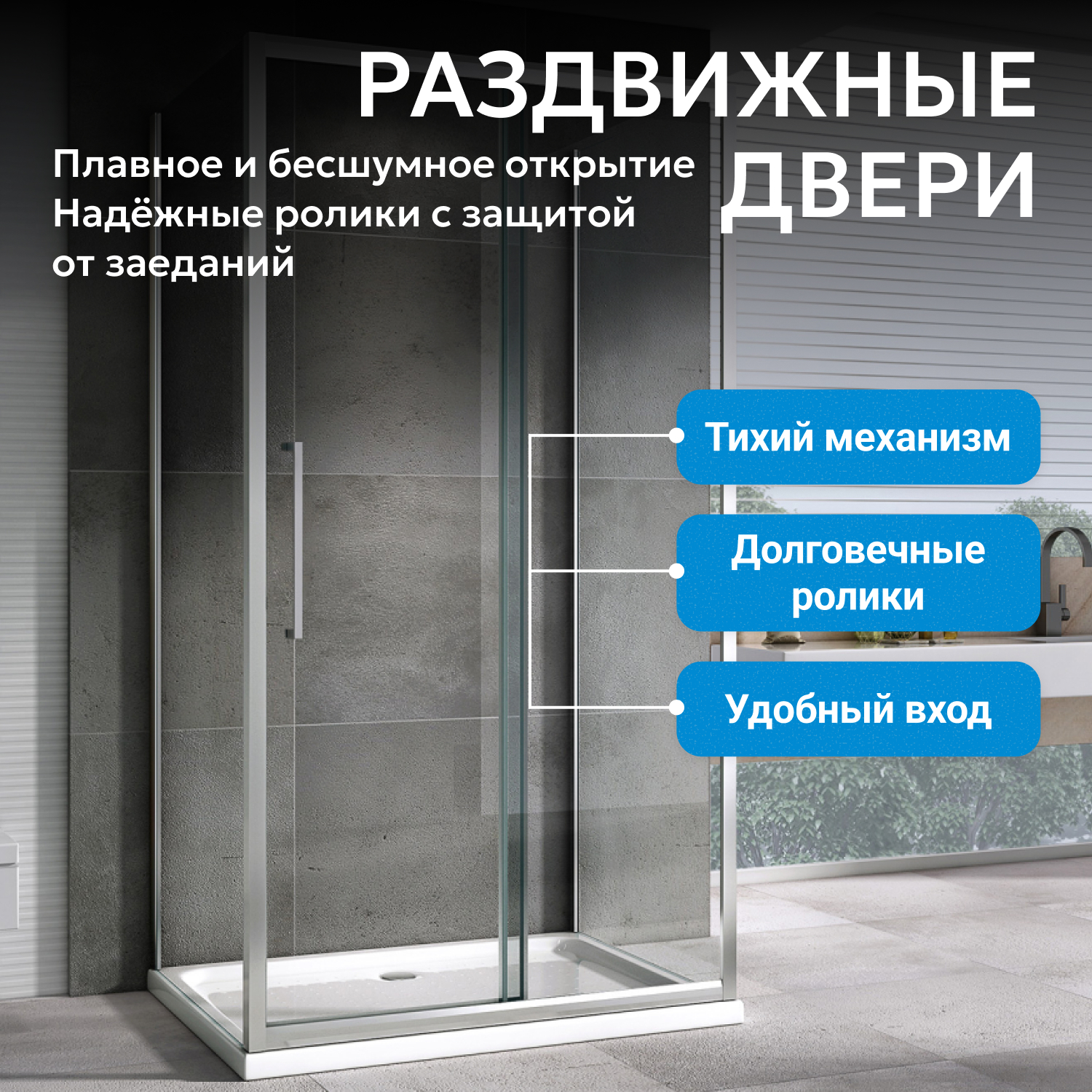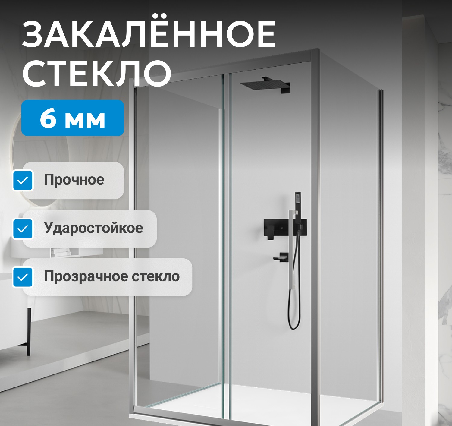 - Прозрачное закаленное стекло толщиной 6 мм устойчиво к механическим воздействиям, увеличенная металлическая ручка обеспечивает удобство использования. Раздвижная дверь на двойных роликах открывается плавно и без шума.