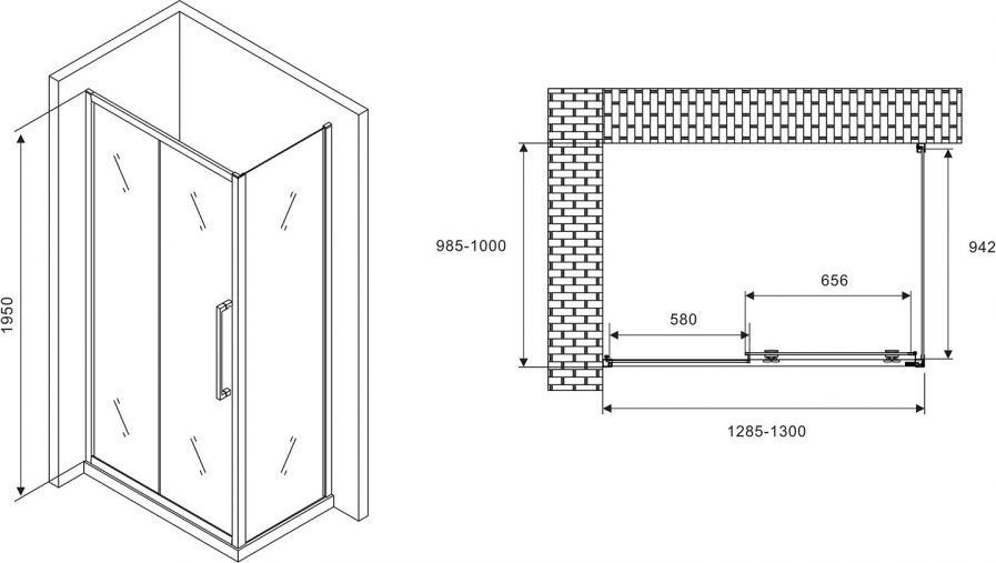Душевое ограждение Abber Schwarzer Diamant AG30130H-S100 1300х1000х1950 мм, профиль - хром, стекло - прозрачное 6 мм. Поддон приобретается отдельно. Дверь 130 см, душевая стенка 100 см.