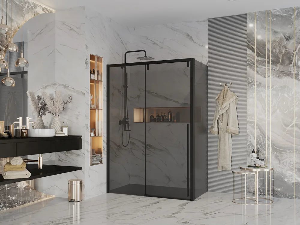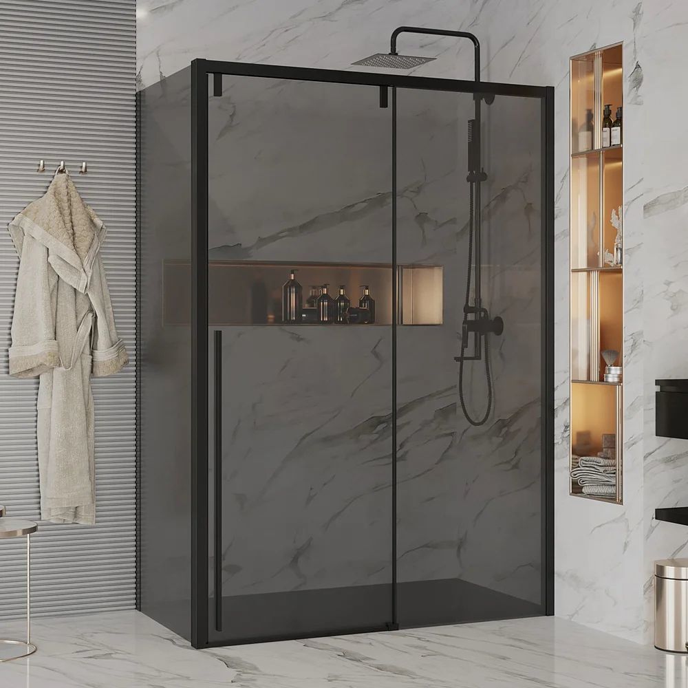 Душевое ограждение Ambassador Intense, размер 1500х900х2000 мм, профиль чёрный, стекло тонированное 8 мм. Габариты регулировки (1485-1500)х(885-900)х2000 мм, ширина входа 640 мм. Поддон приобретается отдельно. Дверь 150 см, душевая стенка 90 см.