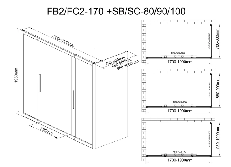 Душевое ограждение Avacan FB2-170-SB90MT, размер (1700-1900)х900х1950 мм, профиль чёрный, стекло матовое. Вход 595 мм, габариты регулировки (1700-1900)х1950 мм.