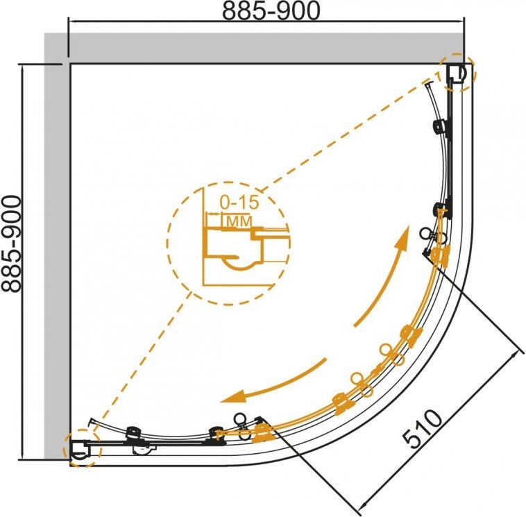 - Габариты с диапазоном регулировок: (885-900)x(885-900)x1950 мм