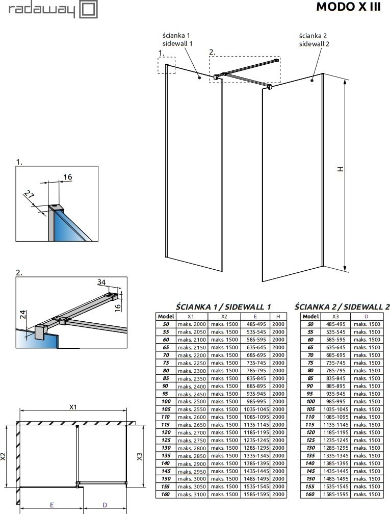 Душевое ограждение Radaway Modo X Black III 1300х800х2000 мм. Цвет профиля – черный, цвет стекла – прозрачное, 10 мм. В комплект входит 2 перегородки с держателем и промежуточный кронштейн.