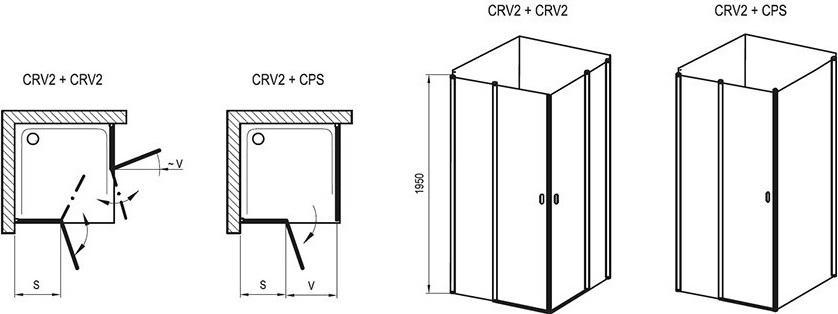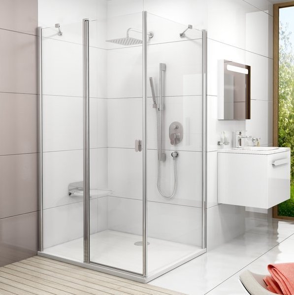 Душевое ограждение Ravak Chrome CRV2+CPS, размер 90x100х195 см с угловым входом, в комплекте металлический держатель. Профиль - сатин, стекло - Transparent, вход 460 мм. Дверь 90 см, душевая стенка 100 см.