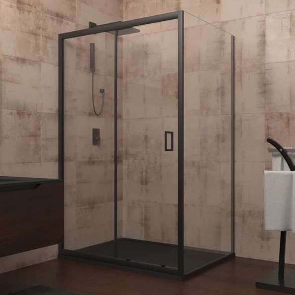 Душевое ограждение Veconi Rovigo RV-046B (VN46B+KP03B), размер 140х90х195 см, профиль чёрный, стекло прозрачное, вход 600 мм. Габариты регулировки (1390-1440)х(880х910)х1950 мм. Дверь 140 см, душевая стенка 90 см.