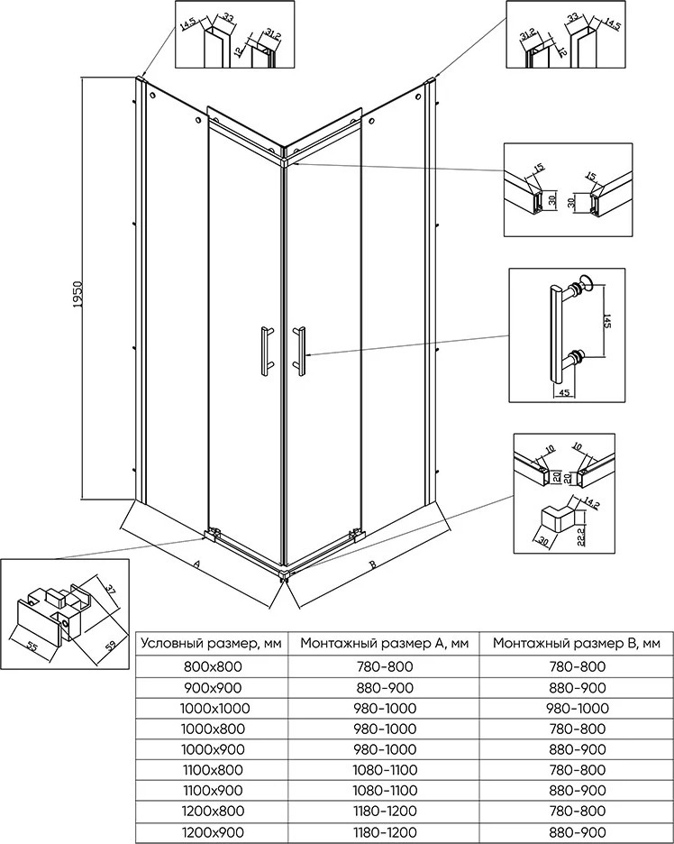 Душевое ограждение Veconi Rovigo 800x800x1950 мм, профиль черный матовый, стекло прозрачное 6 мм, ширина входа 420 мм. Габариты регулировки (780-800)х(780-800)х1950 мм.