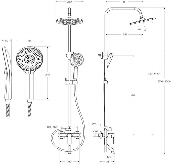 - Оснащение: эксцентрики, переключатель потоков, душевой шланг ПВХ длиной 150 см, ручной душ 3-х режимный, верхний душ, смеситель с поворотным изливом