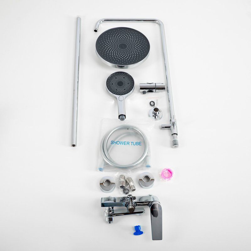 • Оснащение: эксцентрики, переключатель потоков, душевой шланг ПВХ длиной 150 см, ручной душ 3-х режимный, верхний душ, смеситель с поворотным изливом