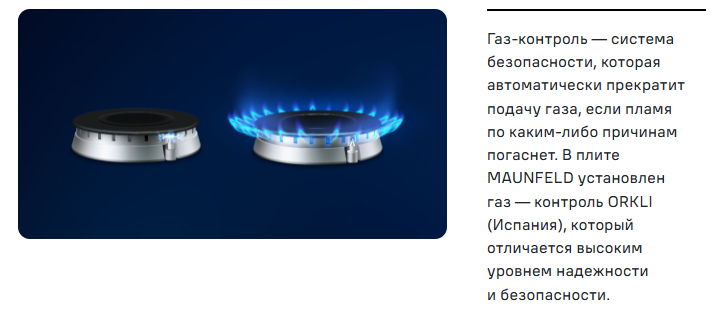 Газовые плиты MAUNFELD укомплектованы высококачественными европейскими комплектующими: газ-контроллерами ORKLI (Испания), газовыми кранами COPRECI (Испания). Данные производители являются мировыми лидерами в производстве надежных и безопасных комплектующих для газовых плит.