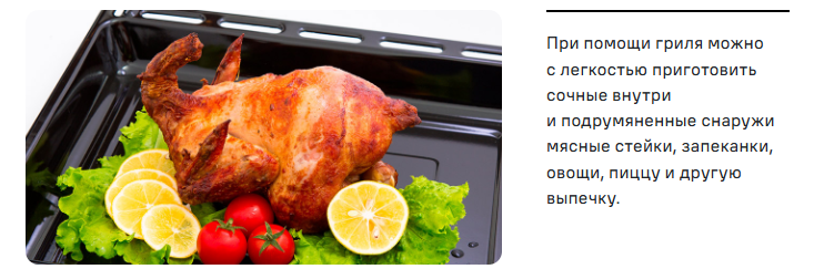 Духовка оснащена функцией гриль, которая идеально подойдет для приготовления сочной курочки с хрустящей корочкой. Все, что вам нужно – лишь выбрать режим, остальное духовка сделает за вас.