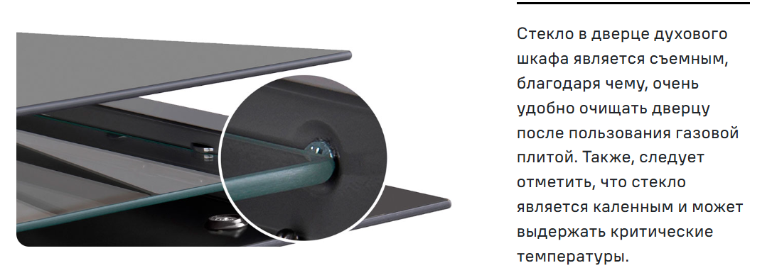 Стекло в дверце духового шкафа является съемным, благодаря чему очень удобно очищать дверцу после пользования газовой плитой. Также следует отметить, что стекло является калёным и может выдержать критические температуры.
