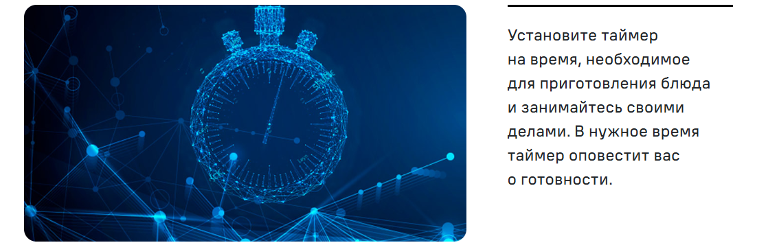 Данная модель оснащена звуковым сигналом. Как только истекает заданное таймером время, раздается звуковой сигнал, оповещающий вас о готовности блюда.