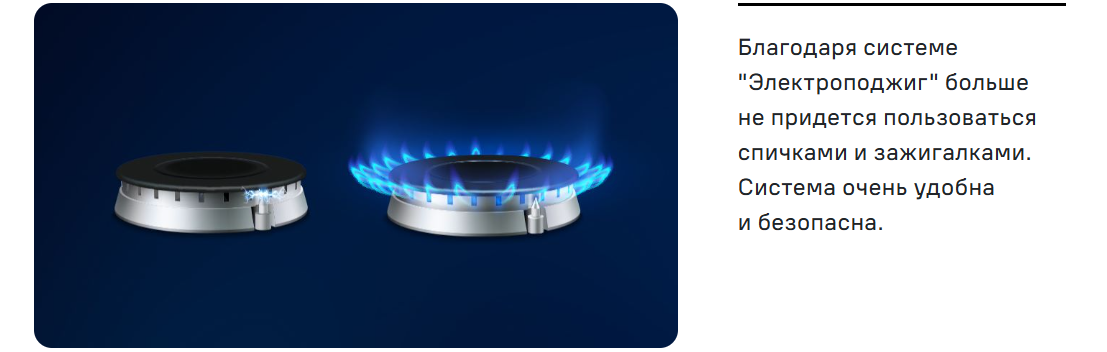 Функция электроподжиг конфорок способно значительно сэкономит ваше время и избавит от необходимости каждый раз при включении пользоваться спичками.