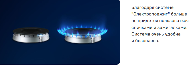 Функция электроподжиг конфорок способно значительно сэкономит ваше время и избавит от необходимости каждый раз при включении пользоваться спичками.