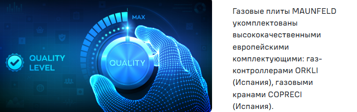 Газовые плиты MAUNFELD укомплектованы высококачественными европейскими комплектующими: газ-контроллерами ORKLI (Испания), газовыми кранами COPRECI (Испания). Данные производители являются мировыми лидерами в производстве надежных и безопасных комплектующих для газовых плит.