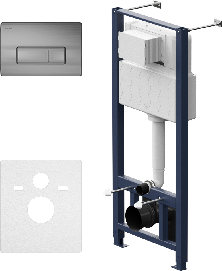 Максимально полная комплектация - все необходимые крепления патрубки звукоизолирующая прокладка в комплекте. Вертикальные ребра жесткости в конструкции рамы – дополнительная опора в месте давления керамики на стену. Благодаря им инсталляция более универсальная и подходит для унитазов любых размеров включая унитазы с небольшой контактной поверхностью. Нет необходимости докупать дополнительные аксессуары для монтажа таких унитазов. Благодаря цельному стальному профилю 40*40 мм толщиной 2 мм инсталляция выдерживает нагрузку до 400 кг. Цельный бесшовный бачок из полиэтилена с защитой от конденсации. Комфортное использование благодаря заливному клапану с низким уровнем шума - менее 20 Дб. В комплекте пневматическая двухрежимная клавиша из ABS пластика в цвете никель матовый.