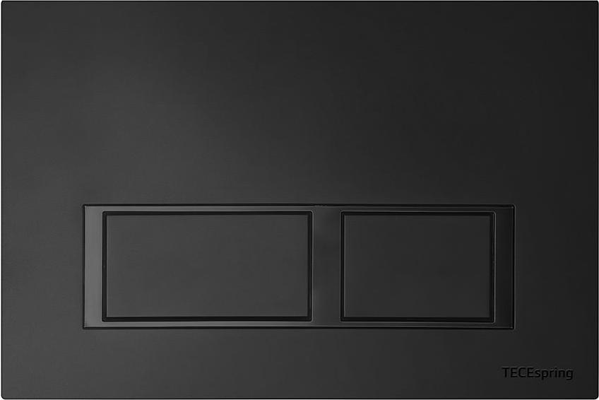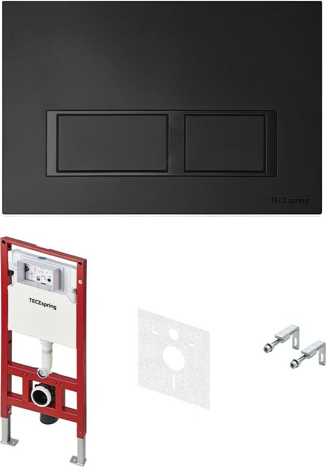 Инсталляция для подвесного унитаза TECEspring со звукоизоляционной прокладкой и панелью смыва, цвет кнопки чёрный матовый.