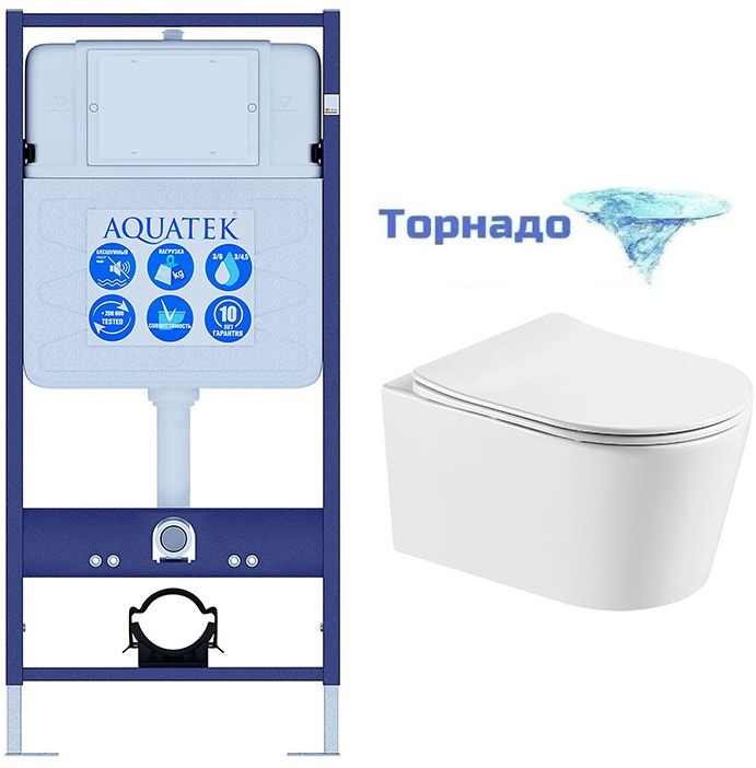 Инсталляция с подвесным унитазом комплект: Aquatek INS-0000012 с подвесным безободковым унитазом Оберон AQ1363WT-00 сиденье микролифт (Система смыва торнадо)