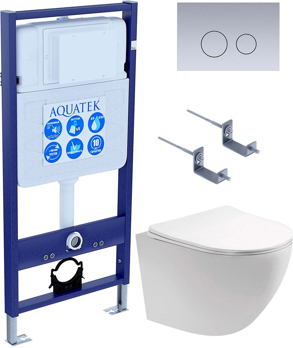 Инсталляция с подвесным унитазом комплект: Aquatek Set INS-0000012 с подвесным безободковым унитазом Европа AQ1901-00 сиденье микролифт, крепление, кнопка смыва хром матовый.