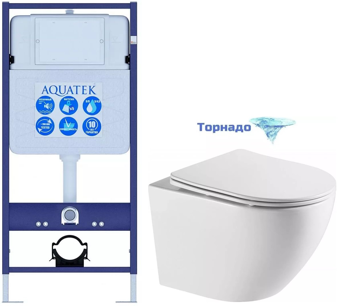 Инсталляция с подвесным унитазом комплект: Aquatek Standart 50 INS-0000012 с подвесным безободковым унитазом Azario Grado AZ-0046-UQ3 сиденье микролифт (Система смыва торнадо). Кнопка смыва приобретается отдельно.