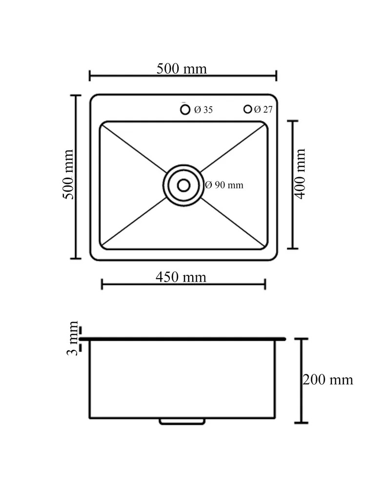 Пример: Внешний размер мойки - 800х500 мм. Размер отверстия под данную мойку 780х480 мм.