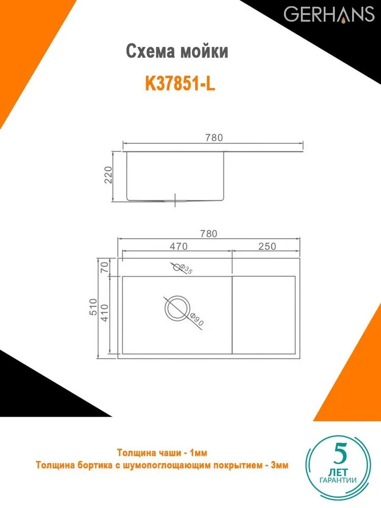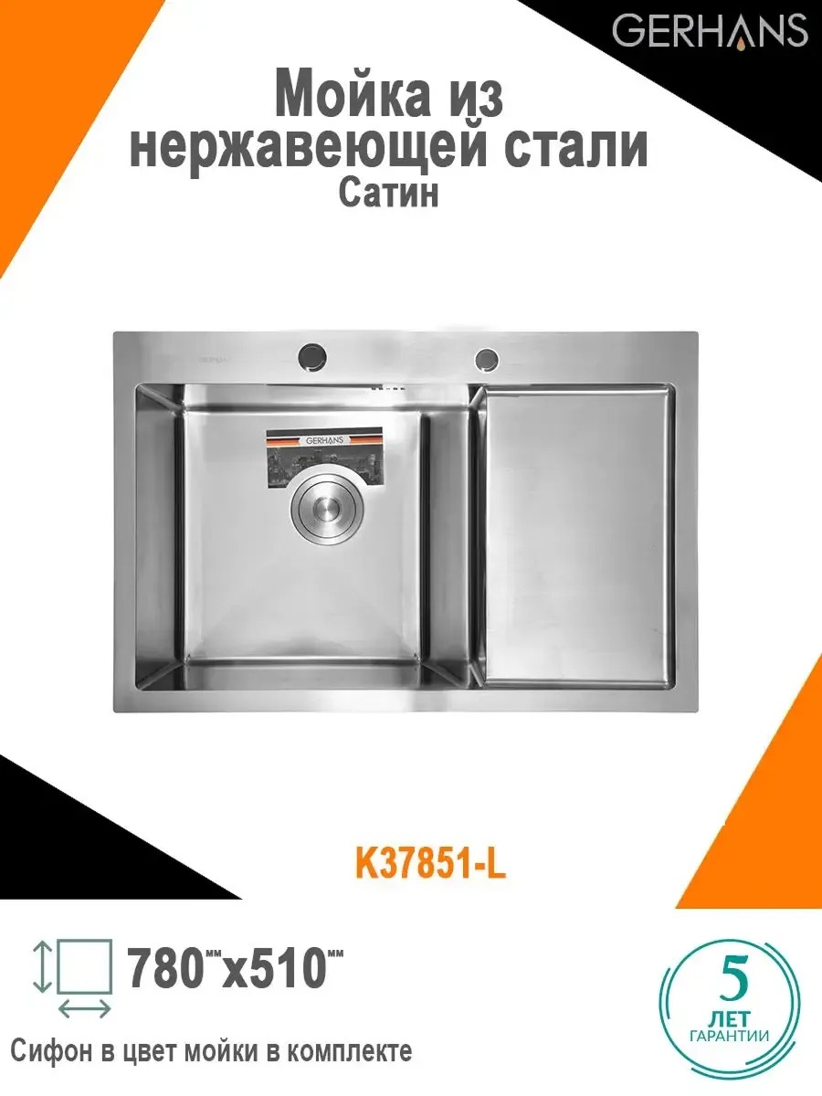 Кухонная мойка Gerhans K37851-L 1 мм, нержавеющая сталь L