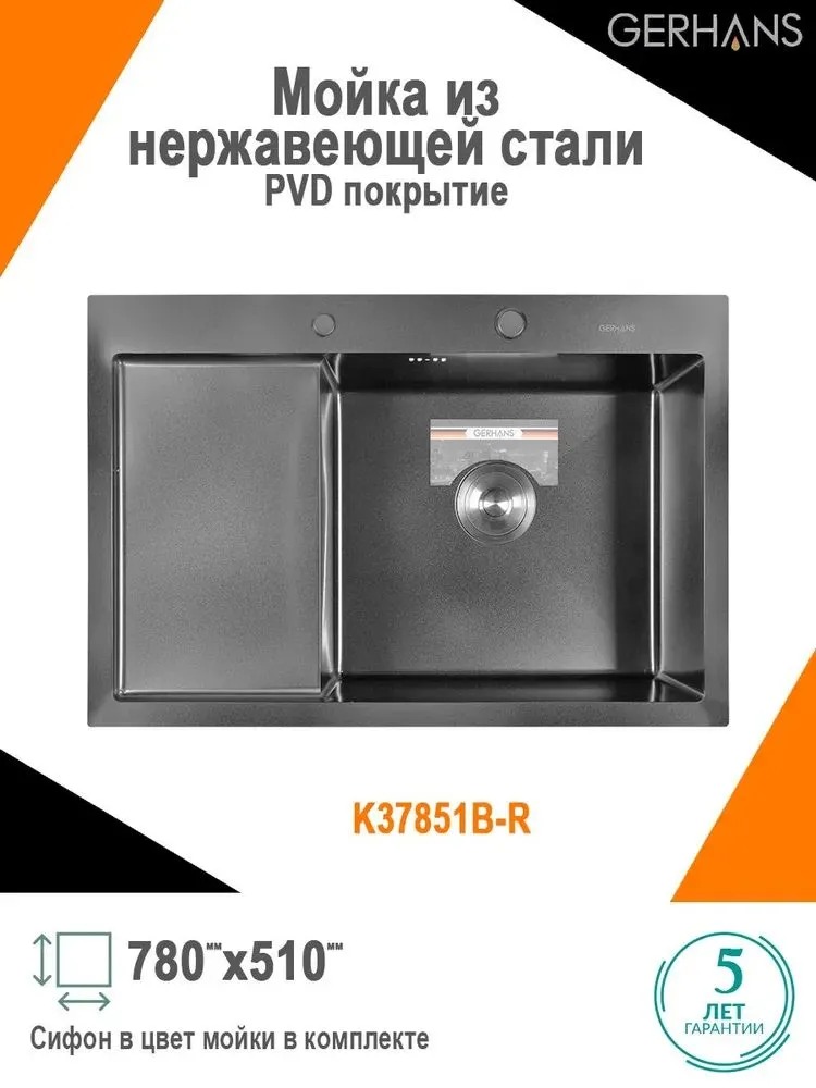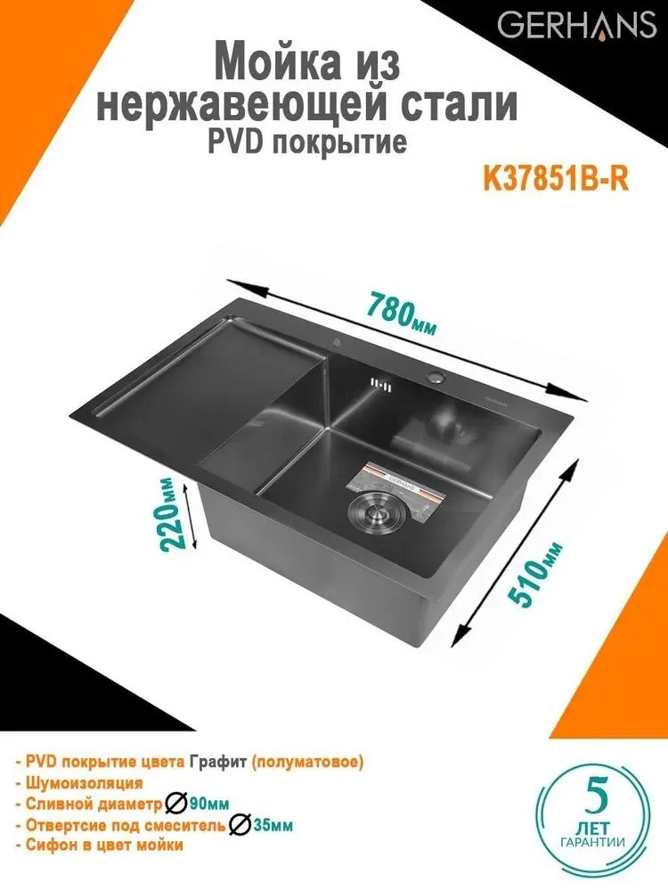 Кухонная мойка Gerhans K37851B-R, материал нержавеющая сталь. Цвет графит.