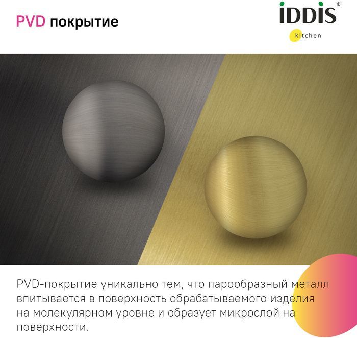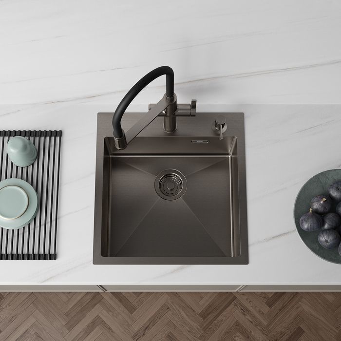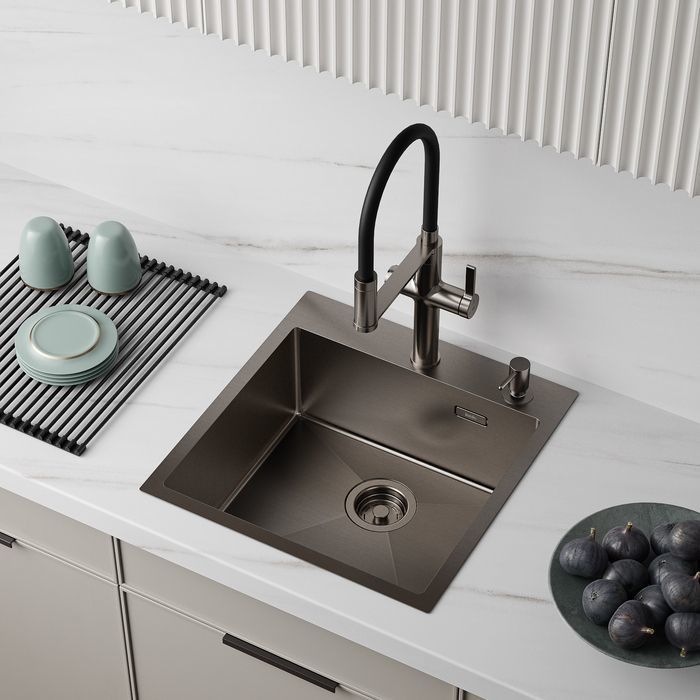 - Красивый и стойкий графитовый цвет достигается путем обработки мойки парообразным металлом: частички краски проникают в структуру стали и образуют микрослой (PVD-покрытие) на поверхности.