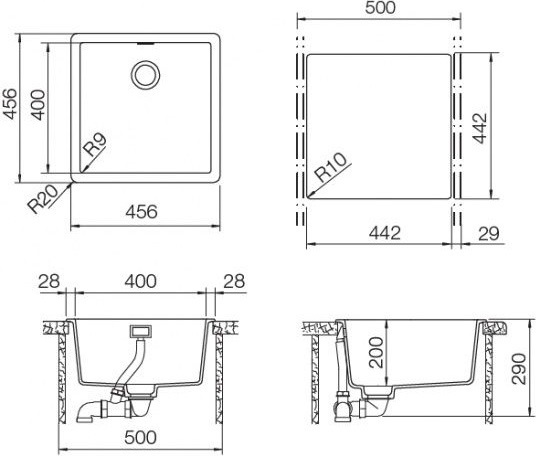 Врезная установка - способ установки, при котором в столешнице вырезается отверстие под размер мойки. Данный параметр подразумевает, что мойки будут устанавливаться поверх столешницы. Как правило размер отверстия под мойку на 2 см (20 мм) меньше внешнего размера мойки. Пример: Внешний размер мойки - 800х500 мм. Размер отверстия под данную мойку 780х480 мм.