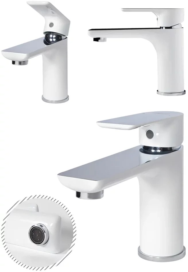 Набор смесителей 3 в 1 для ванны с коротким изливом Grocenberg GB1009WC: смеситель для раковины + смеситель для ванны + душевой гарнитур, материал латунь, цвет белый хром.