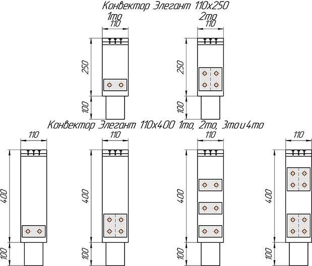 - Конвекторы Элегант выпускаются в концевом и проходном исполнении, в настенном и напольном вариантах. По конструкции подключения могут быть с нижним подключением или со встроенным терморегулирующим клапаном. Конвекторы Элегант работают при давлении до 15 атм, с температурой теплоносителя до 130 °С.