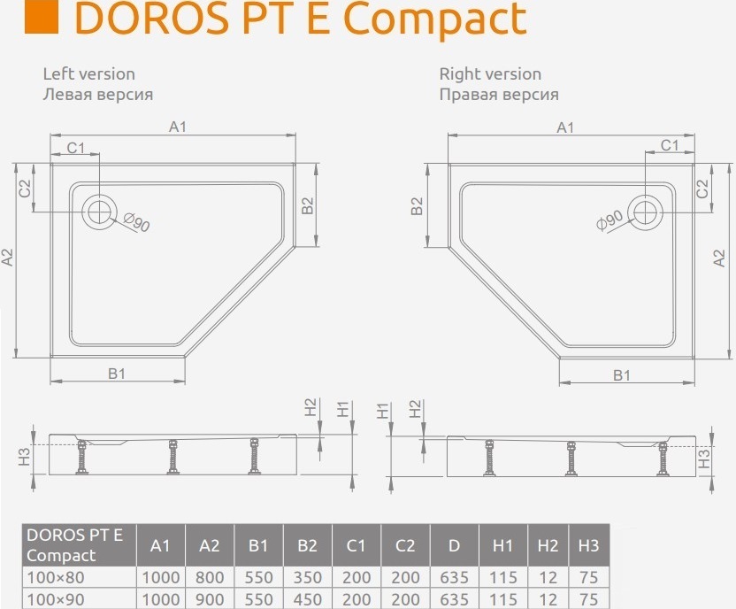 Поддон акриловый Radaway Doros PT E Compact 1000х900х115 мм. Цвет - белый, материал - акрил. Отверстие под сифон - 90 мм. Ножки в комплекте.