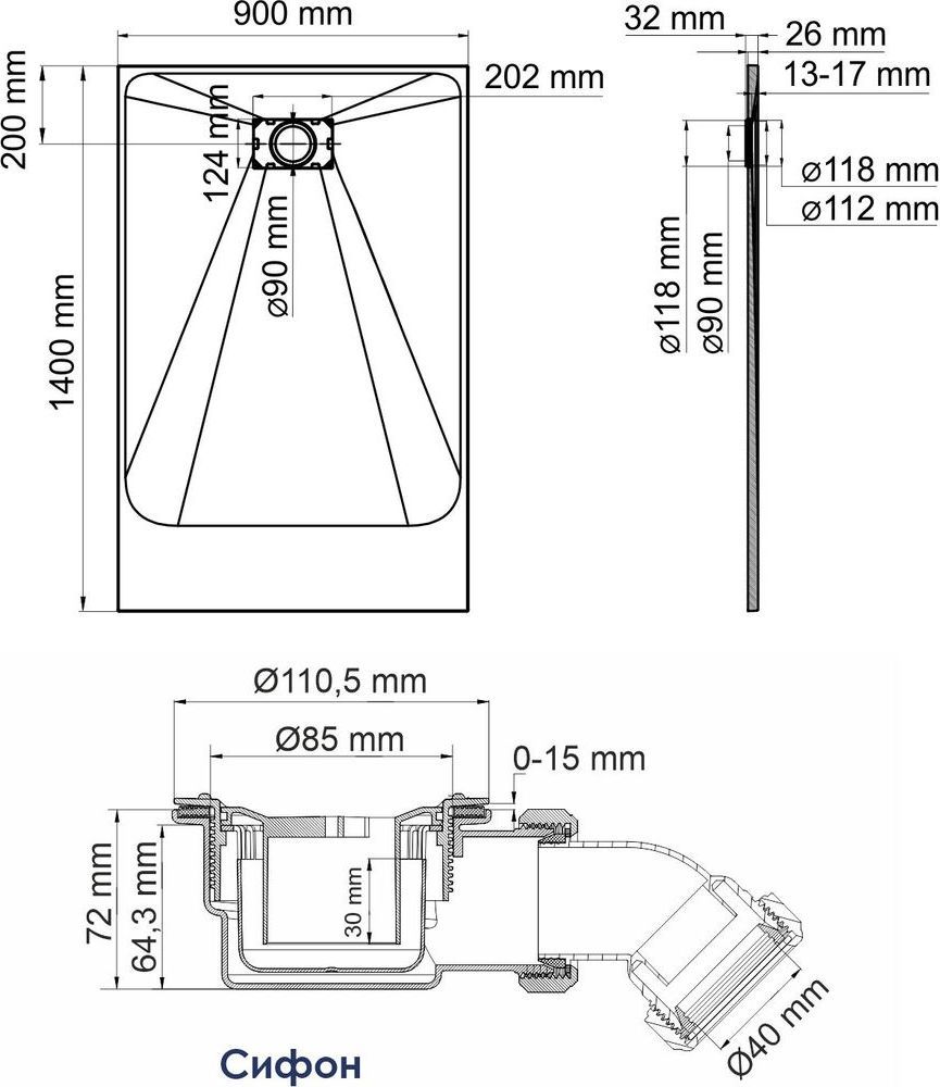 Поддон SMC WasserKraft Main, размер 1400х900х26 мм, материал SMC (стеклопластик). Сифон в комплекте 90 мм. Цвет белый.