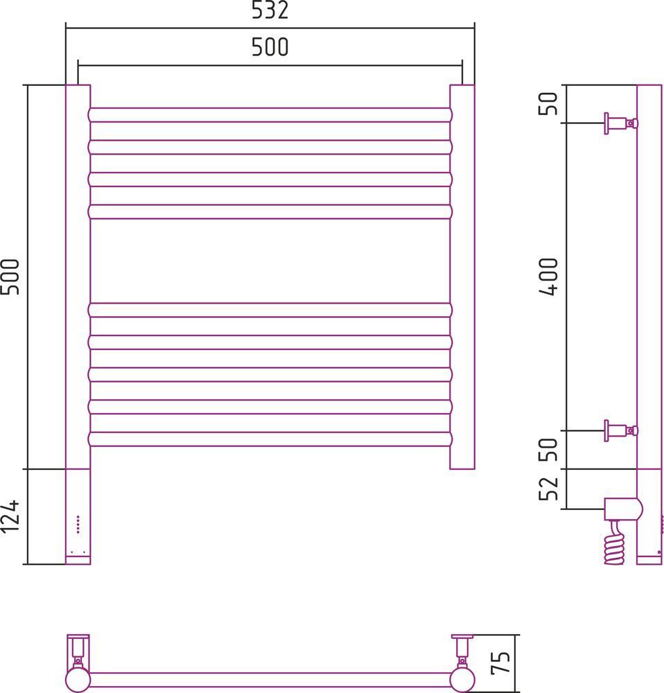 Электрический полотенцесушитель Сунержа Богема 3.0 500х500 мм, 9 перекладин(4-5). Мощность 300 Вт, цвет состаренная бронза. Интегрированное в корпус скрытое подключение.