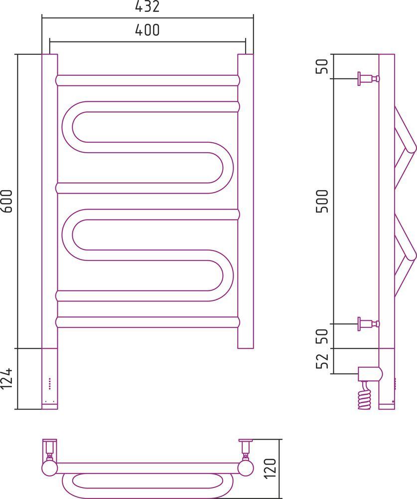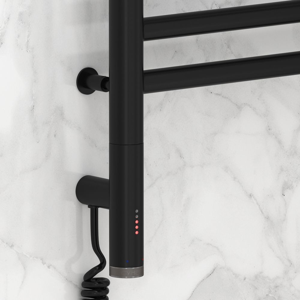 Полотенцесушитель электрический Сунержа Элегия 3.0, размер 600х400 мм, 8 перекладин. Мощность 300 Вт, цвет чёрный матовый. Интегрированное в корпус скрытое подключение.