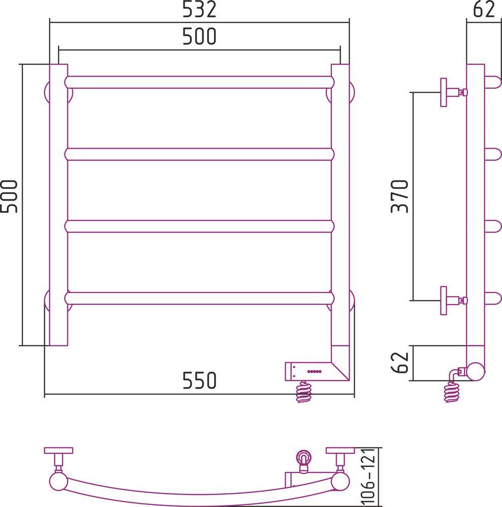 Электрический полотенцесушитель Сунержа Галант 2.0 500x500 мм, 4 перекладины. Мощность 300 Вт, цвет белый матовый. Возможна установка модуля скрытого подключения.